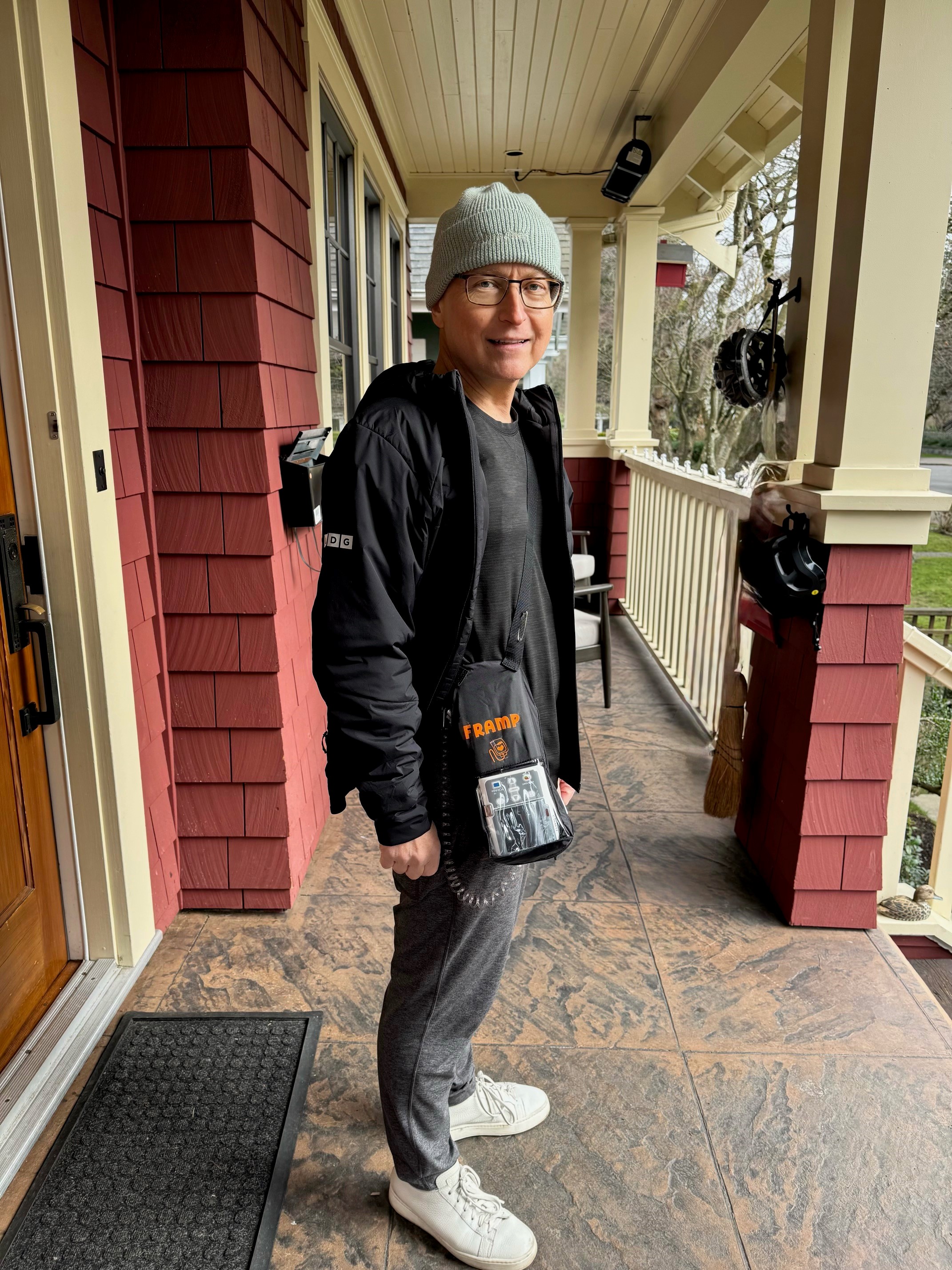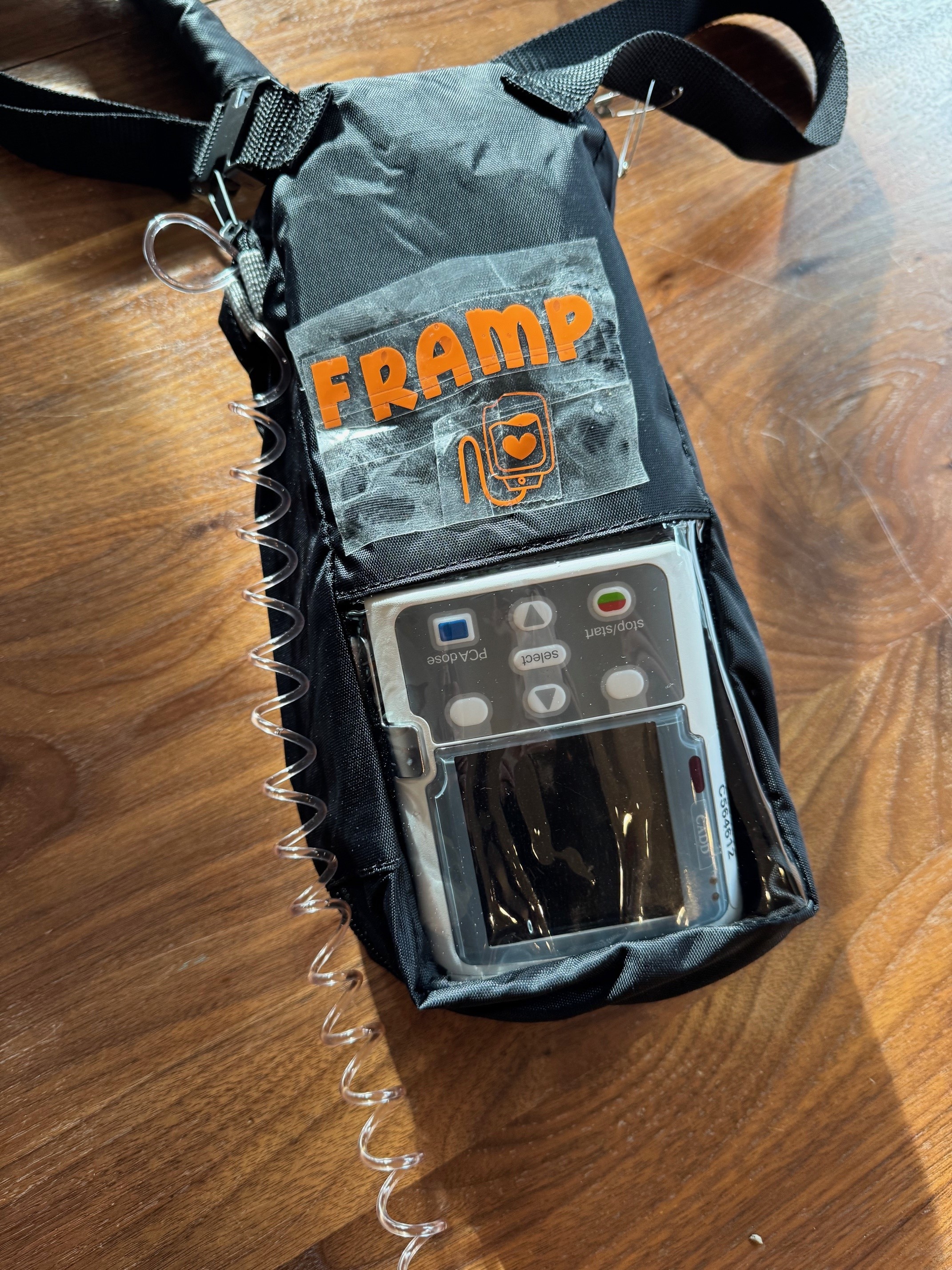 Frank's two kids were so excited he would be home with them while undergoing treatment, they nicknamed his IV pump FRAMP – a playful mix of Frank and pump – and created its own logo that combined a heart and an IV pump.