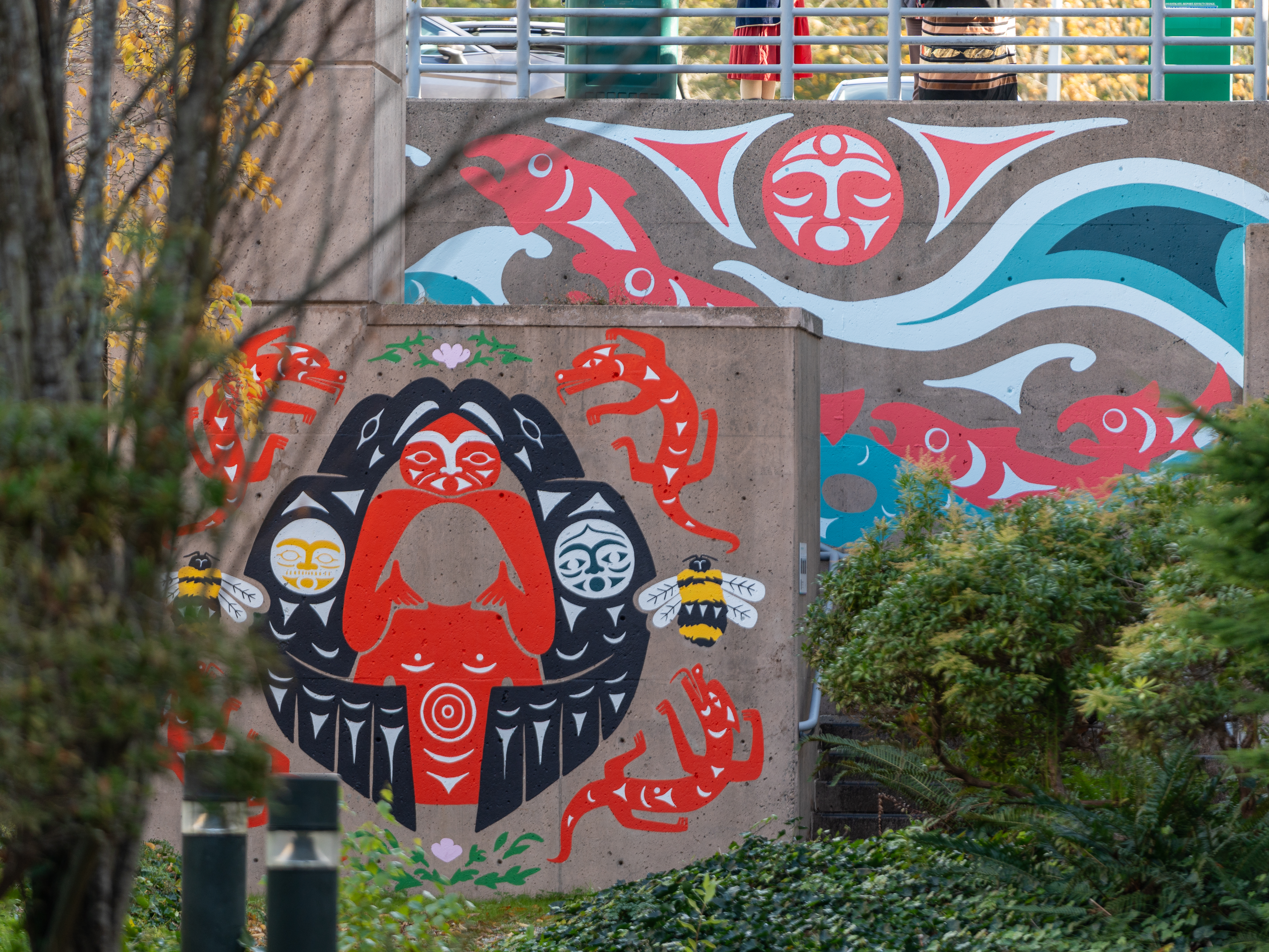 Lhuxw u' tu Huli (The Flow of Life) mural by artist Eliot White-Hill Kwulasultun, at BC Cancer - Surrey.