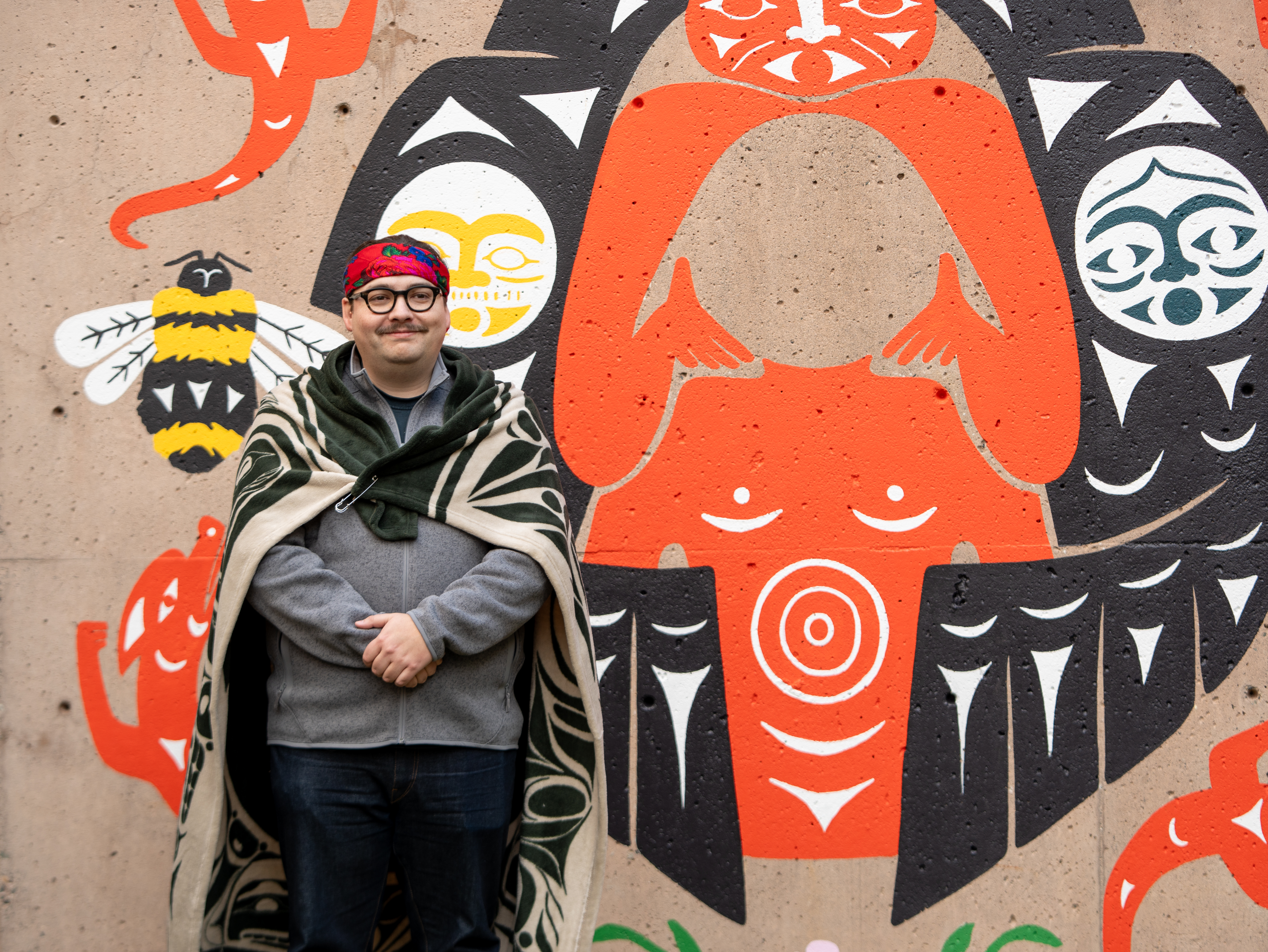 ​​Artist Eliot White-Hill Kwulasultun next to his mural entitled Hulit (To Heal) at the Oct. 29, 2025, blessing/unveiling of his mural installation at BC Cancer - Surrey.​​​