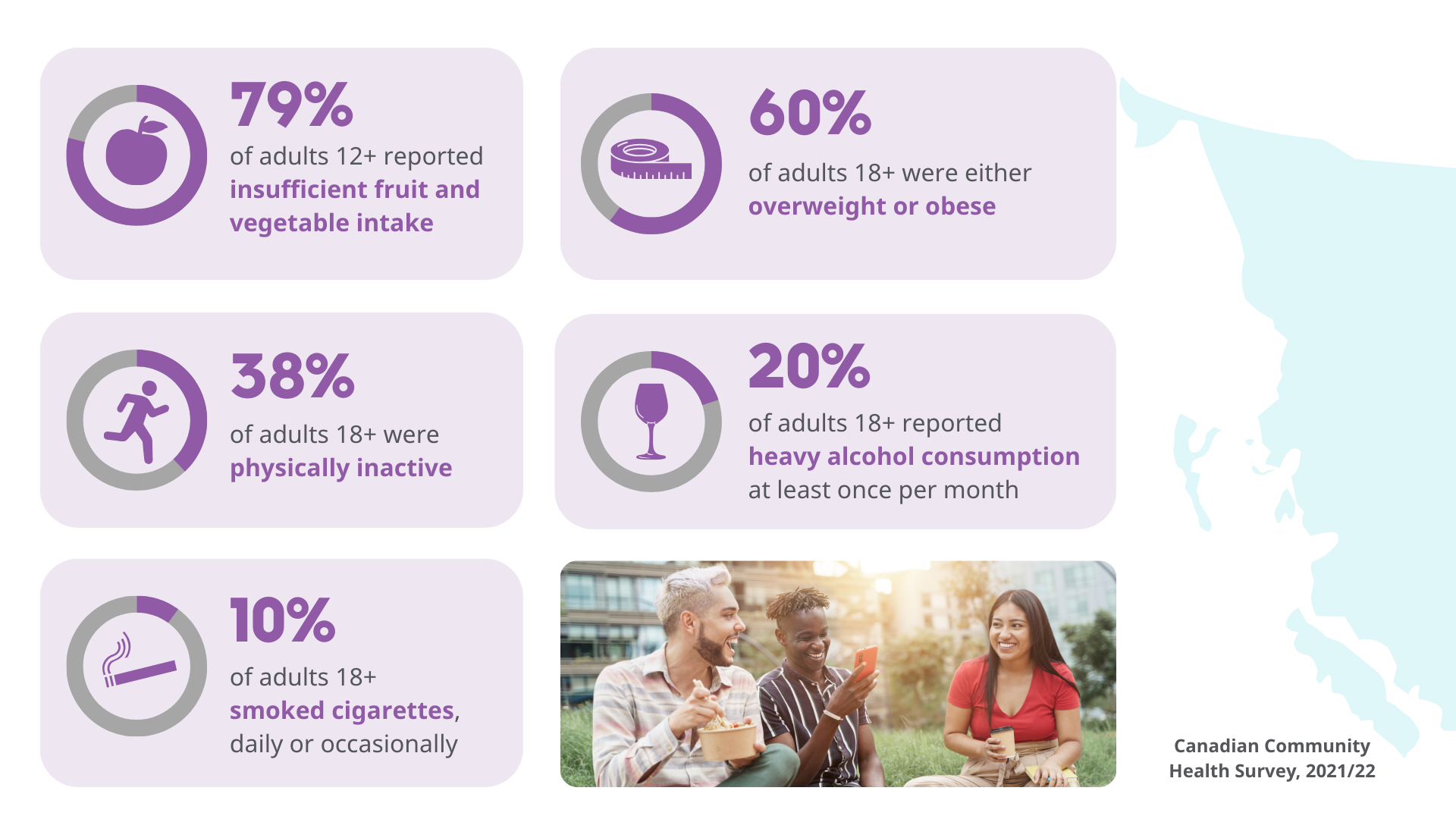 Aligned with BC's 10-Year Cancer Action Plan, the Cancer Prevention Indicator Report takes a comprehensive approach, exploring common cancer risk factors, such as ultraviolet (UV) radiation, commercial tobacco and alcohol use, through a health equity lens.