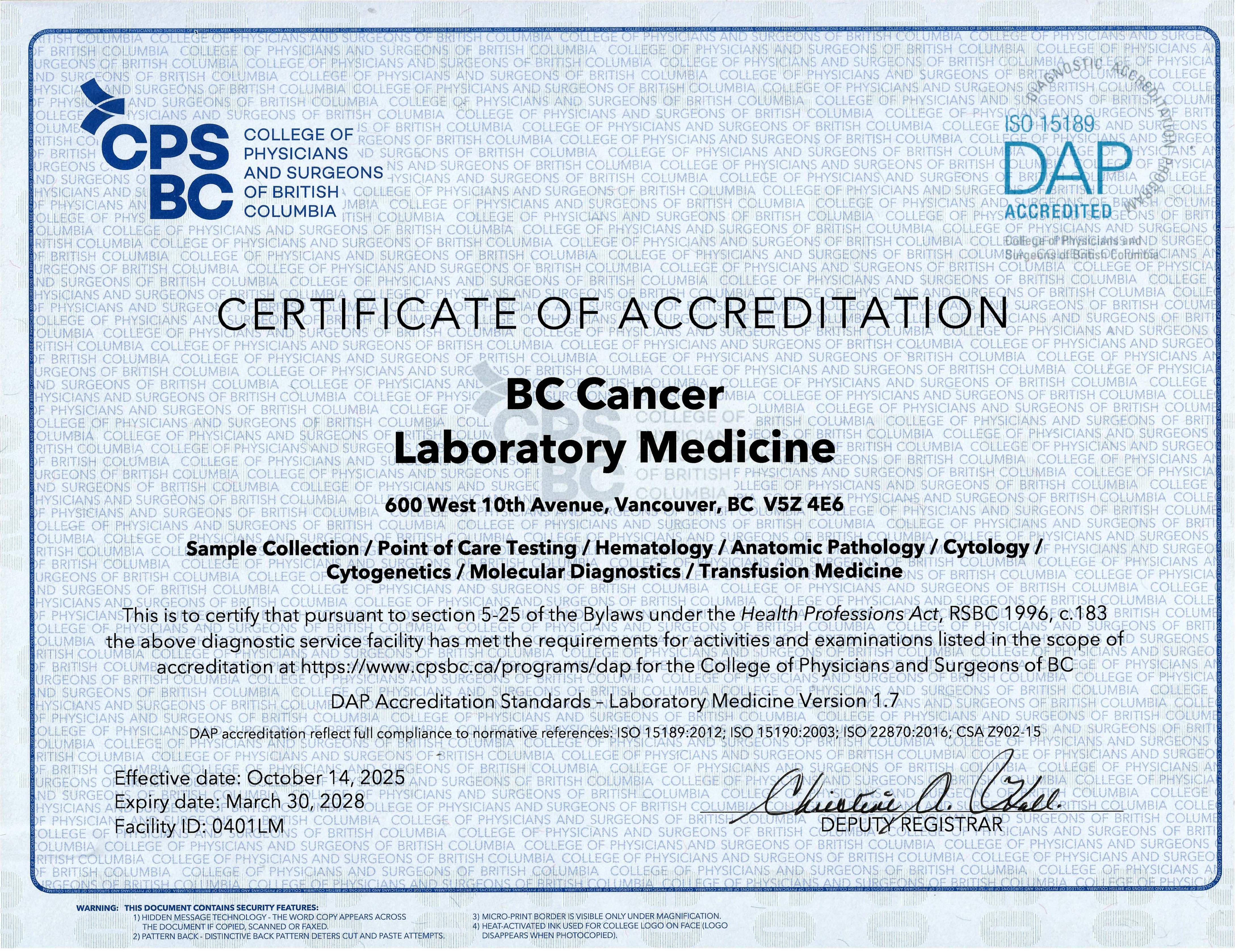Diagnostic laboratory services include phlebotomy, anatomic pathology, diagnostic cytology, flow cytometry and cancer genetics. Testing performed in these sections is available through referrals from physicians and the BC cancer centres.